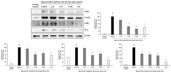 Effects of AyuFlex® on the expression of iNOS, 5-LOX, LTB4, and IL-6 in arthrodial cartilage. The expression of iNOS (135 kDa), 5-LOX (78 kDa), LTB4 (36 kDa), and IL-6 (25 kDa) was measured by western blotting. Protein bands were quantified utilizing ImageJ. As the control for normalization, β-actin was utilized. The results are expressed as the mean ± SEM of independent experiments (n = 3/group). A, AyuFlex®; I, Ibuprofen. * p < 0.05 and ** p < 0.01, in comparison with the MIA-induced control group; ## p < 0.01, in comparison with the non-MIA induced control group.