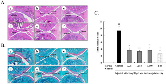 Effects of AyuFlex® on joint pathology in MIA-incurred OA in rats. (A) Knee joints were stained with H&E and (B) Safranin-O, (C) and graded on a scale 0‒13 scale using the Mankin scoring system. (a) Normal Control group, (b) MIA Control group, (c) MIA + AyuFlex® 25 mg/kg, (d) MIA + AyuFlex® 50 mg/kg, (e) MIA + AyuFlex® 100 mg/kg, and (f) MIA + Ibuprofen 20 mg/kg. The results are expressed as the mean ± SEM (n = 5/group). A, AyuFlex®; I, Ibuprofen. Scale bar = 300 μm. * p < 0.05 and ** p < 0.01 in comparison with the MIA-stimulated control group; ## p < 0.01, in comparison with the non-MIA induced control group.