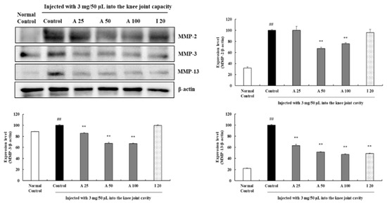 To identify the effects of AyuFlex® on MMPs in the cartilage tissues of OA incurred rats, the protein levels of MMP-2, -3, and -13 were evaluated. As shown in Figure 9, the injection of MIA considerably upregulated MMP-2, -3, and -13 expression than the normal control group. The protein expression of MMP-2, -3, and -13 was significantly reduced with AyuFlex® and ibuprofen treatment compared with the MIA treatment (control group). When compared with the MIA-injected group, the 25 mg/kg AyuFlex®-treated group reduced the expression levels of MMP-2, -3, and -13, by 0.1%, 14%, and 36%, respectively. Treatment with 50 mg/kg AyuFlex® substantially decreased (p < 0.01, for all conditions) the expression of MMP-2, -3, and -13, by 32%, 32%, and 48%, respectively, with respect to the expression levels in the MIA-treated group. The 100 mg/kg AyuFlex® evidently downregulated (p < 0.01, for all conditions) the MMP-2, -3, and -13 expression levels to 24%, 33%, and 52%, respectively, of those observed in the MIA-treated group (Figure 9).