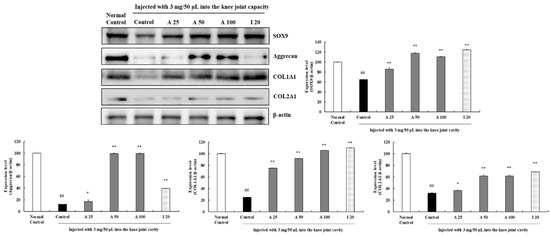 To investigate the impacts of AyuFlex® on the expression of collagen synthesis-involved proteins in cartilage tissues of OA induced rats, the protein levels of SOX9, aggrecan, COL1A1, and COL2A1 were evaluated. As shown in Figure 10, injection of MIA considerably diminished SOX9, aggrecan, COL1A1, and COL2A1 expression compared with that in the normal control group. When it was compared with the MIA-injected group, the 25 mg/kg AyuFlex®-treated group upregulated the expression levels of SOX9, aggrecan, COL1A1, and COL2A1 by 1.3-fold, 1.3-fold, 3.0-fold, and 1.1-fold, respectively. Treatment with 50 mg/kg AyuFlex® considerably upregulated (p < 0.01, for all conditions) the expression of SOX9, aggrecan, COL1A1, and COL2A1 by 1.8-fold, 8.0-fold, 3.6-fold, and 1.9-fold, respectively, with respect to the expression levels in the MIA-treated group. The 100 mg/kg AyuFlex® significantly increased (p < 0.01, for all conditions) the SOX9, aggrecan, COL1A1, and COL2A1 expression levels to 1.7-fold, 8.0-fold, 4.2-fold, and 1.9-fold, respectively, of those observed in the MIA-treated group (Figure 10).