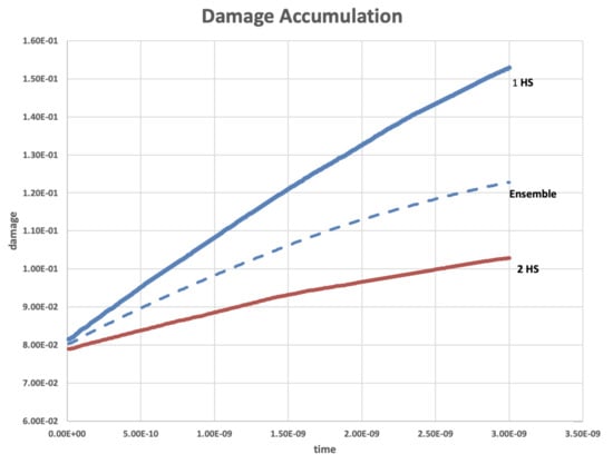 I will close with one final thought. Fracture is not only a statistical process, it is a stochastic process. In Figure 11, it is shown that the number of hotspots in a standard cell is . This is an expectation value; in the 100 ensemble runs that generated that result, 94 runs had one hotspot and six runs had two hotspots. It would be possible to work out the statistics of damage, time to failure, damage at failure and for time to failure separately for an ensemble in which only one hotspot appears, and separately for an ensemble in which two (or more) hotspots appear. An explicit example is shown in Figure 1. These would represent different models. Then in the engineering code, one could randomly assign one or the other of these models to the cells with appropriate probability. The necessary statistics could be easily generated in the array code.