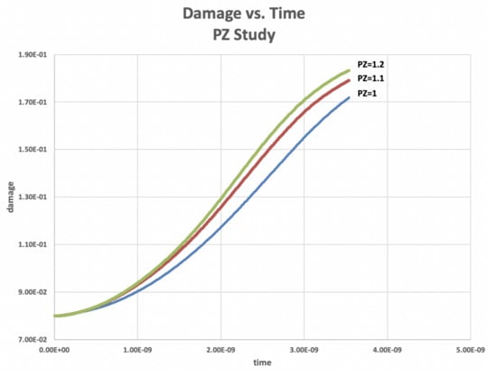 In Figure 6, the sensitivity of the model to three choices of process zones (PZ) is explored by plotting the evolution of damage in time. The three curves represent process zones that are , and of the crack radius. The process zone determines when neighboring cracks may begin to interact. Despite choices that represent a significant fraction of the crack radius itself, the sensitivity is small. The damage at time of failure differs by much less than and the residual stress shows even less sensitivity. The time to failure does show larger sensitivity, since the process zone effectively makes the cracks bigger.