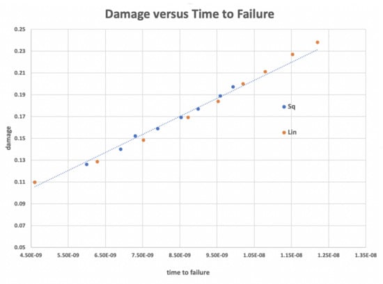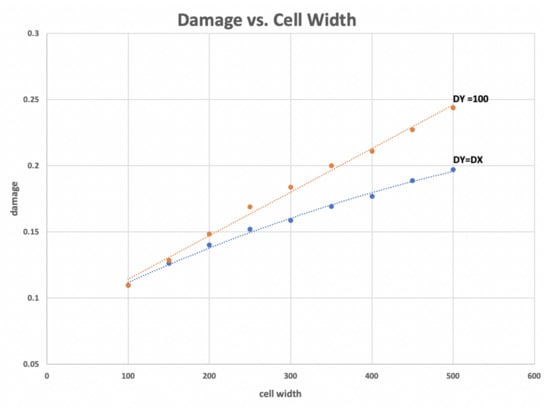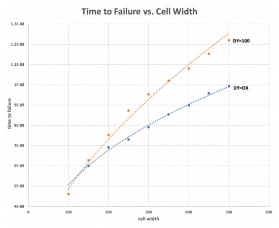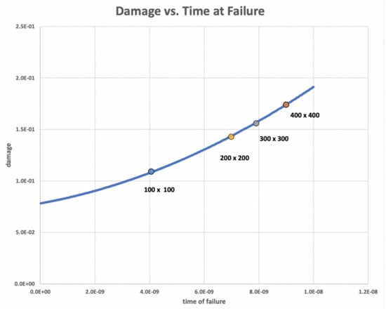 Figure 7 and Figure 8 show array code results for the dependence of time to failure and of damage at time of failure for two variations of cell size. In one variation, the cell remains square so that . In the second variation, only varies while μm. The point at μ is common to both sets of data. The graphed results show a systematic increase in the apparent strength of the larger computational cells, as defined by the level of damage that can be supported before failure; that is the case for both variations of increasing the cell size. Further, each of the four curves in those figures can be accurately modeled by a scale-invariant power law, which is shown on the graph. Both figures also show that the thinner cells, i.e., where are stronger than the square cells where .