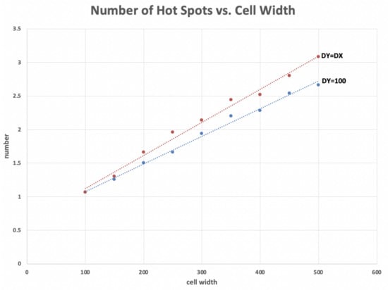 My choice of length scales shown in Table 2 is somewhat arbitrary. I associate the initial crack size distribution with an average grain size of microns. Assuming the exponential size distribution in Equation (8), I choose the maximum crack radius (cutoff radius) to be slightly less than micron; the radius of the maximum crack sets the subcell to be microns. I will define a standard model by setting and to be 100 microns. The relevance of the standard model will become clearer in Section 6 and Section 7 where the effect of the size of the computational cell is discussed. With those choices, the dimensions of the array code then are and . I note in Figure 11 that the number of hotspots in the row that first fails in the is typically between one and two. This is of course a function of the specific choices of length scales.