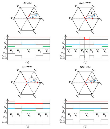 - Hoseini, S.K.; Sheikholeslami, A.; Adabi, J. Predictive Modulation Schemes to Reduce Common-Mode Voltage in Three-Phase Inverters-Fed AC Drive Systems. IET Power Electron. 2014, 7, 840–849. [Google Scholar] [CrossRef]