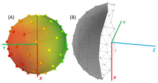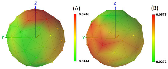 Figure 14) may seem to be clearer. It is obvious at first glance which directions of approach to the measured target are and are not suitable from the repeatability point of view. The color gradient shows the measured repeatability error corresponding to the respective starting point. The orientation of view to the surface of the hemisphere is always in the direction of the positive