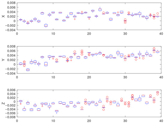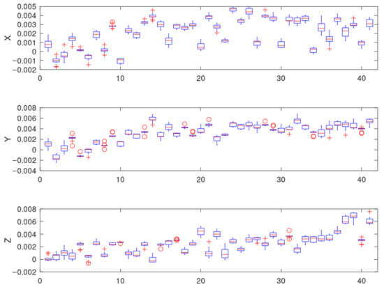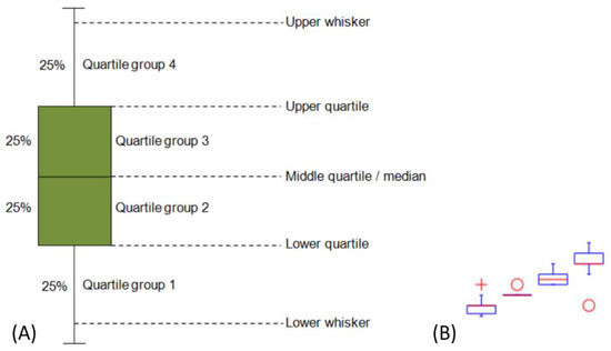 Figure 8. Symbols represent values outside the basic range (outliers). If the value is greater than three times the quartile, it is displayed with the symbol “o”, the symbol “+” is used to display the value in the range 1.5–3 [