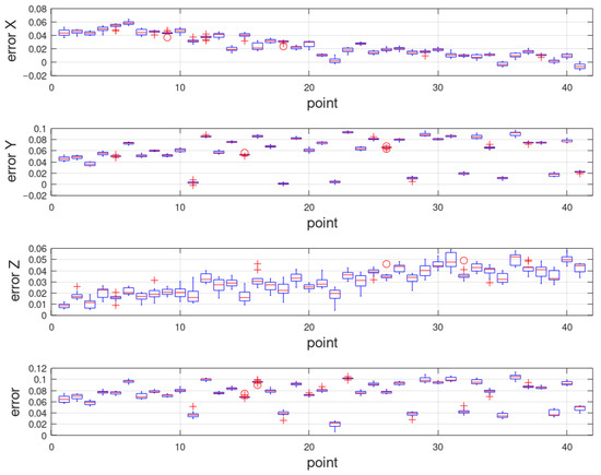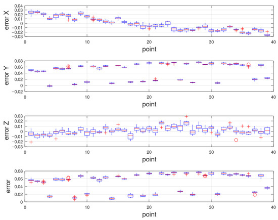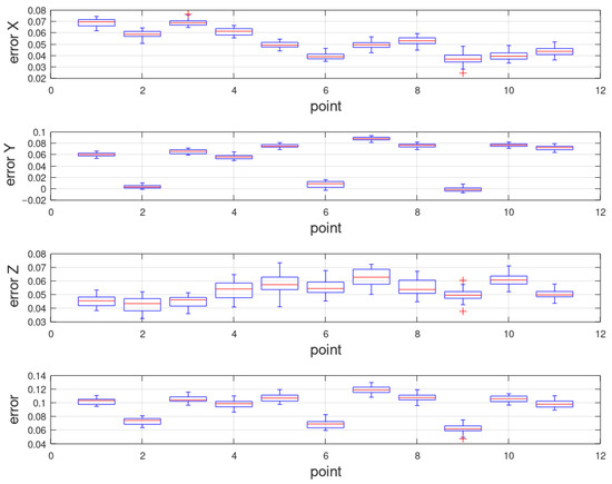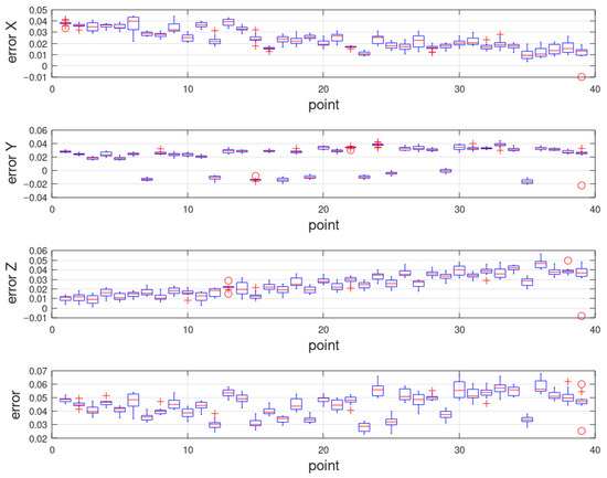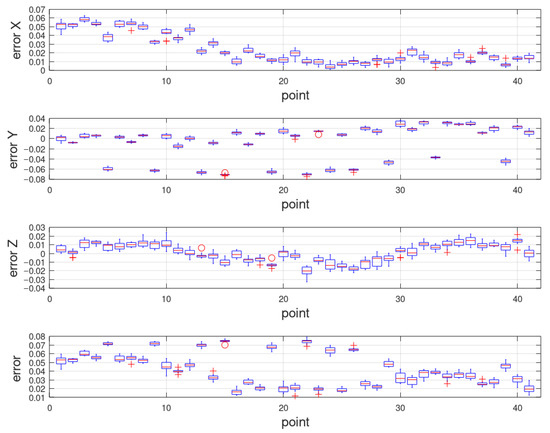 Figure 11) show that the error does not occur randomly (the deviation of the approach to the target was the same regardless of the order in which the starting points were evaluated). By recalculating the results of the measured values of the joint variables to the positioning deviation of the tool center point, the repeatability was determined (inaccuracies that belong to the individual directions of approach at the target).