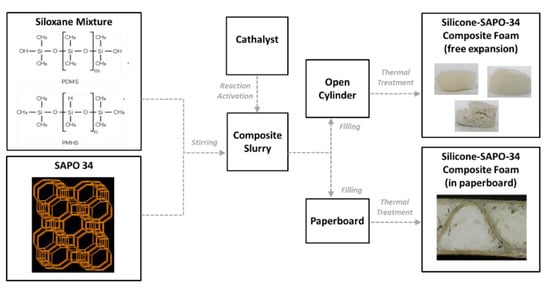 The composite zeolite/siloxane foam was obtained by mold foaming process. Details of compounds used for the synthesis are summarized in Table 1. As zeolite filler, a SAPO34, (AQSOA-FAM Z02, supplied by Mitsubishi Chemicals, Tokyo, Japan) with average size in the range of 4–8 μm was used. The foaming matrix is constituted by two reactants (acquired by Gelest Inc., Morrisville, NY, USA) selected in order to have a dehydrogenative coupling reaction: a Methylhydrosiloxane—dimethylsiloxane copolymer, trimethylsiloxane terminated, PMHS (M.W. 1400–1800, viscosity 15–25 cSt), and a silanol terminated polydimethylsiloxane (PDMS—M.W. 110,000, viscosity 50,000 cSt). In order to activate the reaction between the two siloxane compounds, Tin(II) 2-ethylhexanoate (Sn(II)) (supplied by Sigma Aldrich, St. Louis, Missouri, NY, USA) was used as catalyst.