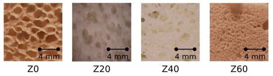 The macroporous morphology of the composite foams at varying zeolite content is reported in Figure 2. All specimens evidenced a micro-structure without macroscopic defects indicating a suitable foaming process. A quite homogeneous cell geometry and distribution can be also highlighted. Although, some differences among foams, at varying zeolite content can be observed. In particular, at low zeolite content (foam Z20), the foam morphology is characterized by well-interconnected bubbles, suggesting the presence of micro channels among the bubbles. In fact, these foams are characterized by an open/close cell structure. The bubble walls are structurally compact, thick and defect-free. This suggests that mechanically unstable regions in the foams were not recognized. During the foaming process, the expansion of the siloxane matrix takes place because of hydrogen gas evolution induced by dehydrogenative coupling reaction. This leads to an expansion of the structure with progressively larger macropores. This effect is more evident as higher is the zeolite content in the composite foam. At increasing filler content, the viscosity of slurry significantly increases, thus hindering the hydrogen induced bubbling growth. As a consequence, foams with high zeolite content (foam Z60) showed numerous small bubbles homogeneously distributed. Some small and local macropores were occasionally evidenced.