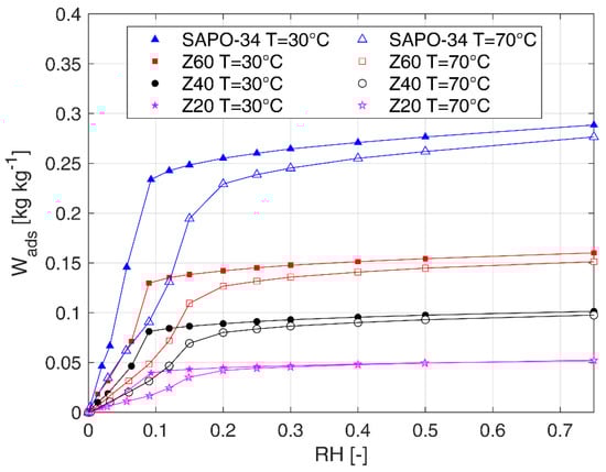 As shown in Figure 3, water adsorption isotherms of pure SAPO34 and of Z20, Z40, and Z60 have been measured at 30 °C and 70 °C. The sharp uptake rise at low relative humidity (RH < 15–20%) and, more generally, the isotherm shape of the pure material is similarly present also in the foams proposed in this work. At each step of relative humidity, sorption capacities of Z20, Z40, and Z60 are lower than one of pure SAPO34. This effect is related to the presence of silicone (included in the reference mass of each sample) that does not participate in the sorption process. As discussed in a previous research [22], the reduced adsorption capacity is in agreement with the zeolite mass fraction. In fact, if the adsorption capacity were referred only to the dry mass of zeolite of each sample, adsorption isotherm curves of pure desiccant and of foams would be very close (maximum reduction around 14%).