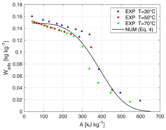 where W0 is the maximum sorption capacity, A is the adsorption potential, E is the characteristic D-A parameter and n is an exponent describing the surface heterogeneity. The adopted fitting approach has already been used by other researchers [26,27] for SAPO34, with satisfactorily results. Parameters can be fitted by using entire data between minimum and maximum sorption capacity (obtaining one set of parameters) [26] or by dividing the uptake curve in different sections (obtaining multiple sets of parameters) [27]. Authors adopted the first approach because it is particularly simple and obtained correlation can be easily implemented in phenomenological models of the device, although the second one generally leads to a more accurate correlation. Obtained parameters of Z60 are W0 = 0.1486 kg kg−1, E = 420 kJ kg−1 and n = 4.01 with R-square equal to 0.9376. Measured adsorption equilibrium curves and numerical results obtained through Equation (4) are reported in Figure 4.