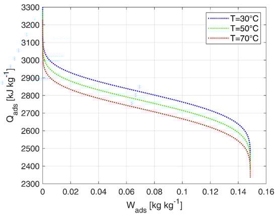 where λ is the enthalpy of evaporation of water at a given temperature and A is the adsorption potential. In Figure 5, the heat of adsorption of Z60 is calculated and plotted against the sorption capacity for different temperatures (by using Equations (4) and (5)).