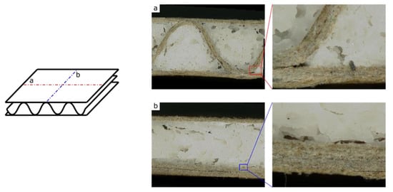 Preliminarily, optical images to assess the morphology of the foamed structure in the paperboard cavities were performed. In particular, the corrugated paperboard samples were cut in transversal and longitudinal direction to corrugation, a and b lines, respectively, as schemed in the drawing reported in Figure 7. No evidence of material loss after the cutting step was observed indicating a good structural stability of the foam filled in the cardboard cavities.