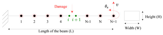 Equation (1) is discretized using 2-nodes beam elements with 2 degrees of freedom (DOFs) per node, a vertical translation v and a bending rotation . As can be seen in Figure 1, the beam is divided into N elements of equal size of and the model has N + 1 nodes. The damage is assumed to be placed within the beam elements of the FE model. Consider the damage at location within node i and of beam. It will be assumed that stiffness reduction falls within one or several elements.