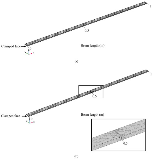 The beams are meshed with tetrahedral elements (6 DOFs per node). The mesh density is in fine controlled by COMSOL. Typically, converged models with damage have 22,000 DOFs. A high mesh density is applied close to the damage area. Figure 2a,b represent 3D healthy and damaged FE models, respectively. A zoomed view of the rectangular geometry damage is shown on Figure 2b.
