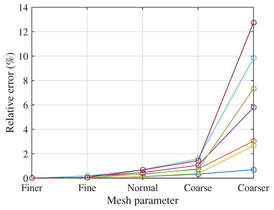 A convergence test is performed to ensure that the 3D FE model is adequately meshed. It is here given for the damaged beam, with a damage at midposition with a width of 2 mm and a depth of 2.5 mm. The beam properties are given in Table 1. The convergence test is carried out by changing the mesh densities. Using the five mesh standard parameters proposed in COMSOL Multiphysics: Finer, Fine, Normal, Coarse, Coarser, the first seven bending natural frequencies are computed. Note that these standard mesh parameters correspond to a number of DOFs varying from 22,000 to 2300 respectively, using tetrahedral elements, and that we rely on COMSOL Multiphysics to adequately mesh the damage area, as shown in Figure 2b. In a convergence study shown in Figure 3, the relative error on the natural frequency (with respect to the “Finer” mesh configuration) is determined. It is shown that the relative error for the “Fine” mesh is below 0.5%. Therefore, it can be concluded that the results are converged for both “Fine” and “Finer” mesh parameters and the frequencies are independent on the mesh size. For this reason, the “Finer” mesh is used in the rest of the study to build a damage library and to estimate geometry damage parameters.