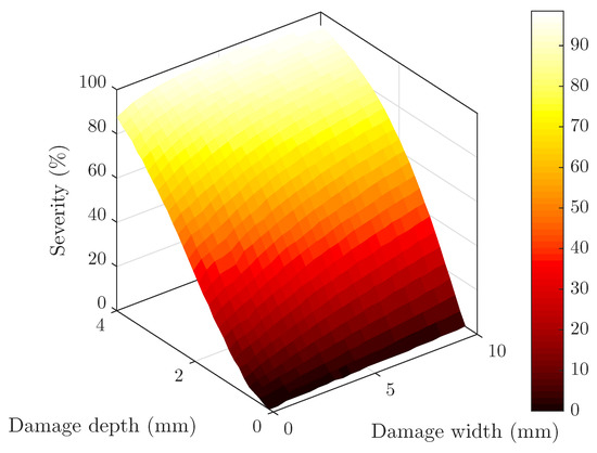 Figure 5 shows the surface view of the damage library built at midposition on the beam. The colorbar represents severity associated to the size of damage. The result of the simulation is, as expected, a smooth surface. Here, the library also illustrates a monotonic response to the size of damages. Interestingly, the width of damage contributes to the decrement of severity to a larger extent compared to its depth.