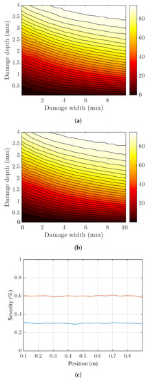 The effect of beam position for building a library is investigated. A library is built by choosing a different beam position, with a damage positioned at 0.3 m. Again, a range of sizes for the rectangular damage is computed and the stiffness is reduced in a selected element during 2D and 3D correlation. Figure 6a,b shows contour view of two different damage libraries which are built at 0.30 m and 0.50 m beam positions, respectively. Note that Figure 6b is simply another view of the results seen in Figure 5. The colorbar represents the percentage of severity corresponding to the depth and width of the damage. The evolution of severity with the geometry of damage is similar for the two positions. In fact, the maximum difference of severity between the two position is 1.8% on the entire domain. Moreover, Figure 6c shows the severity equivalent to a given damage for a range of positions along the beam. Two geometries are shown here: the blue curve is associated to a 1 mm × 1.5 mm damage, and the red curve to a 1 mm × 2.5 mm damage. The results show that the severity corresponding to a given damage geometry has a very small dependence to the position on the range displayed. Thus, it means that the library does not depend on the beam position. Indeed, it is possible to build a library at any position of the beam. Finally, note that it takes approximately 1.5 h on a Intel Core i7 (2.6 GHz) to build an entire map such as the one in Figure 5.
