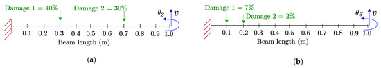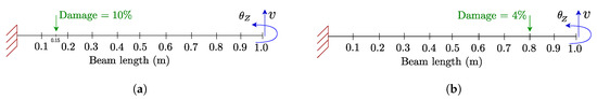 Single-damaged cases set in 2D beam, where positions and stiffness reduction are: (a) 0.15 m with 10%; (b) and at 0.8 m with 4%.