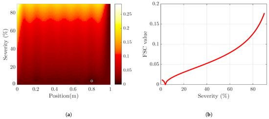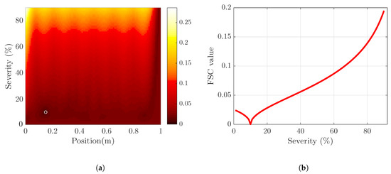 FSC as a function of tested position and severity, where (a) the white circle indicates 4% severity and 0.80 m position identified by the algorithm (b) slice view of 4% estimated damage.