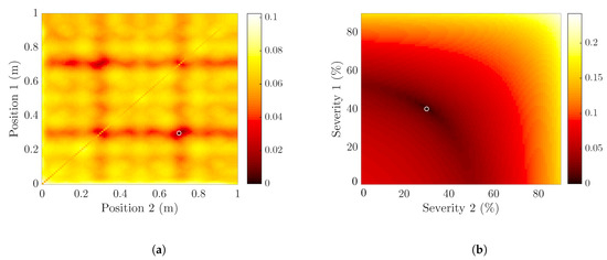 The test was initiated by obtaining a set of frequencies from each numerical case. The natural frequencies are given in Table 4 for damaged cases. Damage identification is done by updating a model embedding two damages, thanks to the FSC. As with single damage, the first seven natural frequencies of the damaged structure were used as an input for the FSC. In double damage identification, there are four parameters (position 1, position 2, severity 1 and severity 2) to identify. Evolution of FSC with parameters for the two studied cases is plotted on Figure 11 and Figure 12. Because it is difficult to represent a variable of four parameters, the plot is split in two in these examples: First, in Figure 11a and Figure 12a, for the actual severities for the two damages (40 and 30% in Figure 11a, 7 and 2% in Figure 12a), the FSC is represented as a function of positions only. Second, in Figure 11b and Figure 12b, for the actual positions of the damages (0.30 and 0.70 m in Figure 11b, 0.45 and 0.55% in Figure 12b), the FSC is represented as a function of severities only. The minimization of FSC gives the following results (indicated as white circles in Figure 11 and Figure 12): for case (a), the severities are 30% and 40% and positions are 0.30 m and 0.70 m. For case (b), the severities are 7% and 2% for two damage localized at 0.10 m and 0.20 m). In the two cases, the estimation correspond to the values given in Figure 10. In other words, the algorithm is employed satisfactorily to identify both locations and severities of double damage.
