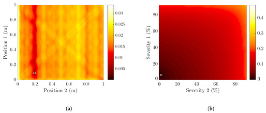 FSC as a function of tested multiple damage positions and severities (a) the white circle indicates that damage positions are 0.45 m and 0.55 m, (b) and severities of localized damages are 7% and 2%.