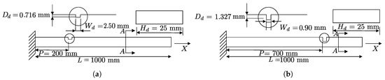 In this section, the strategy is carried out in order to investigate the rectangular geometry damage using all Steps. Figure 13a,b show a detailed 2D view of rectangular geometry cases. Here, the width , depth and height are 2.5 mm, 0.75 mm and 25 mm for rectangular damaged case (a), while 0.9 mm, 1.34 mm and 25 mm dimensions for rectangular damaged case (b), respectively. The rectangular damaged case (a) and (b) are assumed at positions 200 mm and 700 mm on the beam. Numerical cases are meshed and computed in COMSOL Multiphysics in order to obtain the natural frequencies. These frequencies are tabulated in Table 5 for the two rectangular damaged cases.