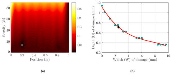 The rectangular geometry damaged case (a) is investigated to find damage properties. Based on the set of frequencies of Table 5, minimizing the FSC yields estimation of position and equivalent severity. Figure 14a shows identified position and severity for rectangular damaged case (a) where the white circle represent 14.37% damage extent at position 0.20 m with a minimum value of 0.011 for the FSC. After obtaining the severity of the damage, it is possible to examine physical damage parameters (width and depth). Figure 14b represents the different possibilities of extracted geometry parameters for 14.37% severity from the damage library (according to Section 4.2). Specifically, the blue dots represent the raw extraction from the library with a 1% tolerance. The red curve is a cubic fit of the raw result. Remember that one value of severity corresponds to two parameters, hence the line. In this section, it is assumed that the width of damage is the actual value, while the depth is a parameter to identify. It is a good way to check the method because if the damage library is reliable, the obtained depth should be the actual depth. In a more general case, it is also possible to assume the smallest detectable size as a width. This makes sense in an experimental context, where a visual inspection would be limited by this smallest detectable size, let us say a hairline thickness. For the rectangular damaged case (a), the assumed width is 2.5 mm. Hence, the result of estimated depth is 0.716 mm, as shown in Figure 14b (black cross). A difference between estimated and actual depth would lie in the tolerance in the library extraction and the curve fitting that is applied.