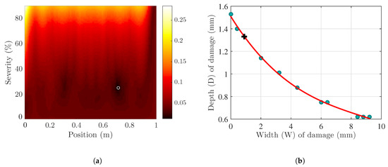 (a) FSC as a function of damage position and severity for damage described in Figure 13a; the white circle indicates that the damage position and severity are 0.20 m and 14.37%, respectively; (b) width and depth are extracted for 14.37% severity from the damage library (blue dots: raw extraction, red line: cubic fit, black cross: recovered geometry).
