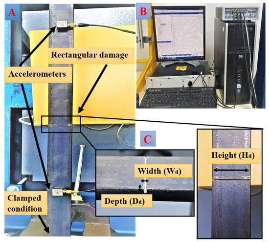 Experimentally tested cantilever beam where (A) shows experimental set up and input/output measurement points with accelerometers; (B) displays acquisition card and software; (C) shows details on the rectangular geometry.