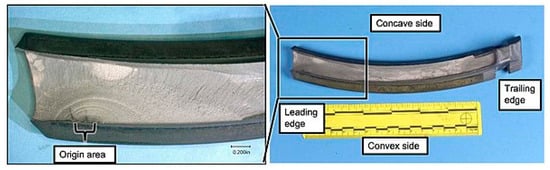 This was evidenced in an event concerning a Boeing 737-700 passenger aircraft on April 2018. In this event, a serious accident occurred when the engine blade ruptured and pierced the cabin of the aircraft, damaging the fuselage and causing injury to the passengers. The news report shown in Figure 1 depicts a failed fan blade as well as a fracture surface with fatigue. The main cause of the accident was that engine blades inspection was not implemented, and the hidden fatigue defects in the engine blades were not detected by the inspector. However, defects can occur during material welding maintenance work, including micro-cracks, incomplete fusion, voids, porosity, blowholes, and inclusion spatter [,]. Once engine blades with hidden cracks have exceeded their service life, fatigue micro-cracks on metal surfaces causes the cracks to continuously expand. The engine aeronautics composite materials (ACM) [] are mainly made of aluminum (titanium) alloy composite materials and related spare parts.