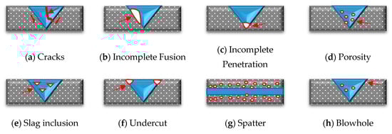 In the dataset, welds for ACM defects in X-ray images can be categorized as either (a) cracks, (b) incomplete fusion, (c) incomplete penetration, (d) porosity, (e) slag inclusion, (f) undercut, (g) welding spatter, or (h) blowholes as depicted in Figure 4. The X-ray images in the dataset were converted into LMDB format and stored for deep learning applications. In the dataset, certain X-ray images in different light conditions and resolutions were labeled with the above defects. An effort was made to prepare the labeled data in terms of AE-RTISNet. In this endeavor, the eight types of label classes were stored in the first row of the category table string of over 6000 labeled X-ray images from the dataset.