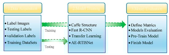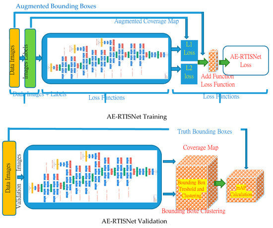 Under the Jetson™ TX2 embedded computer, the AE-RTISNet compiler for C++ code was used to model the eight types of object classification feature maps and a normal regression was used to estimate the object bounding boxes compiler for the deep learning neural network for object detection []. This is an extension to the AE-RTISNet to increase the number of hidden layers. Some changes to accommodate multi-class object detection were also made. This is different from the common practice when applying FCNs []. The determination of the structure model for multi-class object detection contains training and validation steps. Figure 5 illustrates the training and validation procedures in which the L1/L2 loss function is adopted so that the results are not biased to a single class.