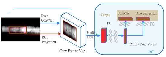 The prepared transfer learning model architecture was evolved from the Fast R-CNN model and Fully Convolutional Network (FCN) frameworks for object detection and semantic segmentation. The layers of Fast R-CNN learn the attention mechanism object detection with a Region Proposal Network (RPN) []. The model of Fast R-CNN is, thus, sufficiently flexible and robust to be applicable. The Fast R-CNN model was used to provide the bounding-box object detection for the design of convolutional networks. The normal Fast R-CNN was extended to allow marking of the defect feature maps using pooling layers, which could lead to faster convolution speeds and better accuracy [].