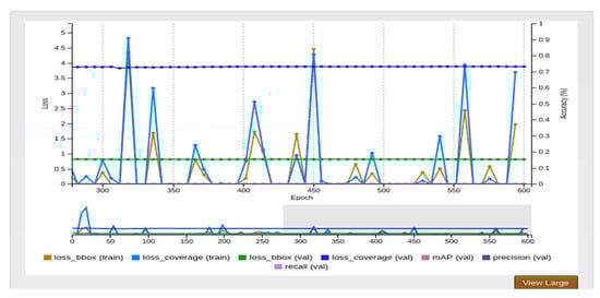 The test process can identify the type of defect even if the original input X-ray image does not require any preliminary training. The customized DNN and the overall neural network model is evaluated in terms of the mAP (mean average precision). The results confirmed that the model reached the technical standards of a qualified human inspector. The average accuracy (mAP) obtained by the experimental test was 0.82 if the image did not contain a defect and was 0.8 if the picture had certain defects. Figure 11 illustrates an inspection result of an X-ray image cracks and blowhole, etc., and Figure 12 depicts the training performance.