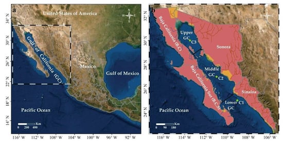 - Lluch-Cota, S.E.; Aragón-Noriega, E.A.; Arreguín-Sánchez, F.; Aurioles-Gamboa, D.; Jesús Bautista-Romero, J.; Brusca, R.C.; Cervantes-Duarte, R.; Cortés-Altamirano, R.; Del-Monte-Luna, P.; Esquivel-Herrera, A.; et al. The Gulf of California: Review of ecosystem status and sustainability challenges. Prog. Oceanogr. 2007, 73, 1–26. [Google Scholar] [CrossRef]