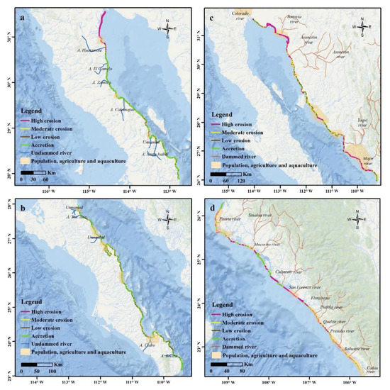 - Oyedotun, T.D.T.; Ruiz-Luna, A.; Navarro-Hernández, A.G. Contemporary shoreline changes and consequences at a tropical coastal domain. Geol. Ecol. Landsc. 2018, 2, 104–114. [Google Scholar] [CrossRef]