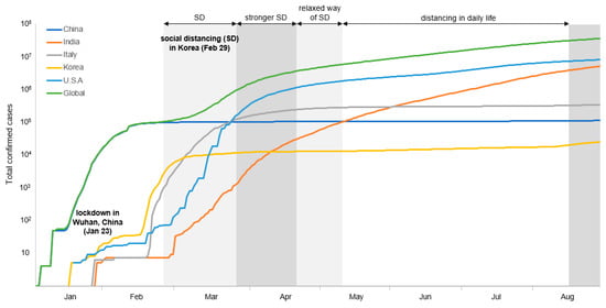 The cumulative number of COVID-19 cases worldwide. The highlighted shadow represents the level of social distancing (SD) in Korea. The data were collected from the WHO Coronavirus Disease (COVID-19) Dashboard [2].