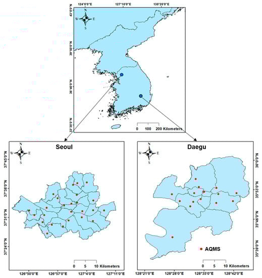 The concentrations of PM2.5, PM10, and NO2 were obtained from Air Korea (www.airkorea.or.kr/web) [36], and all data were applied to the Korea Registry of Environment (KMOE)’s Quality Assurance/Quality Control (QA/QC) procedure. There are 25 and 15 The Air Quality Monitoring Stations (AQMS) in Seoul and Daegu, respectively (Figure 2). We obtained the air pollutant levels on an hourly basis and calculated the daily and weekly averages to compare them to the previous three years (2017–2019). In this study, air pollution levels were analyzed for a total of 18 weeks. Observations were made from January 1, 2020, until May 5, when social distancing (SD) was implemented.