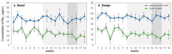 Comparison of average PM2.5 concentrations by week between 2020 and the previous three years in (a) Seoul and (b) Daegu. Highlighted shadow represents the level of social distancing. The error bar means standard deviation.