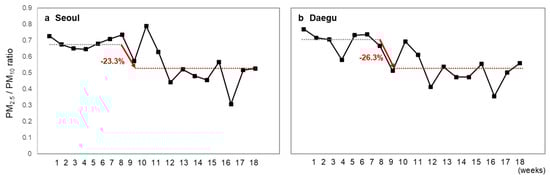 Changes in weekly PM2.5/PM10 ratios in (a) Seoul and (b) Daegu. The black dotted line represents the average ratio before SD, and the red dotted line represents the average ratio after SD. The reduction in the PM2.5/PM10 ratio is highlighted.