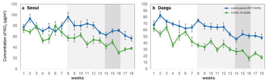 Comparison of average NO2 concentrations by week between 2020 and the previous three years in (a) Seoul and (b) Daegu. Highlighted shadow represents the level of social distancing. The error bar means standard deviation.