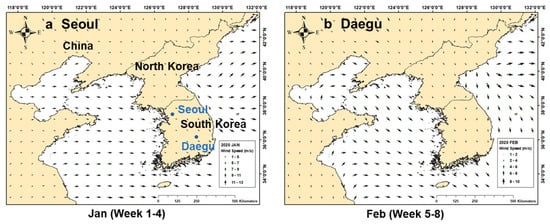 Map of wind speed and direction analysis in the Northeast Asia region in January and February. ((a): Seoul and (b): Daegu)