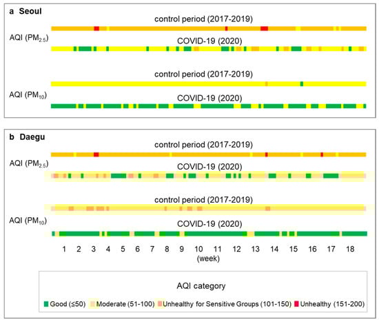 The daily AQI based on the concentrations of PM2.5 and PM10 in Seoul and Daegu is shown in the Figure 8. NO2 could only be calculated from an AQI above 200, but no day exceeded 200 in this study. The AQI results, shown in contrasting colors between the COVID-19 pandemic period and the control period showed a dramatic improvement in air quality. Interestingly, the AQI for PM2.5 has not been classified as unhealthy (red) since the COVID-19 outbreak in either city. During the control period, the values unhealthy for the sensitive group (SG) accounted for the majority, with 91.2% and 92.8% in Seoul and Daegu, respectively, whereas in 2020, the proportions were moderate at 68.3% and 65.9%, respectively.