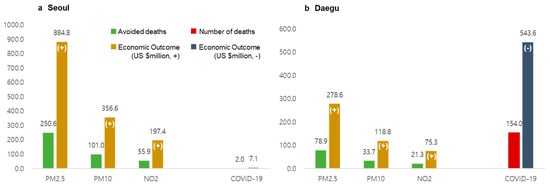 Avoided deaths from PM2.5, PM10, and NO2 reductions over 18 weeks, and associated economic outcomes (+). The economic outcome from COVID-19 deaths was evaluated as (-). ((a): Seoul and (b): Daegu)
