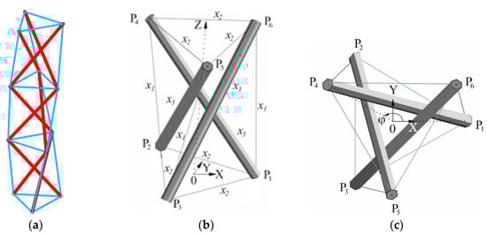 Reference configuration of the tensegrity simplex: (a) tensegrity column; (b) spatial view the tensegrity simplex; (c) top view of the tensegrity simplex .