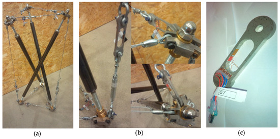 where the cross-cable length is calculated based on the formula (2) for the angle at which the tensegrity equilibrium occurs. It follows from (3) that after pre-stressing at a level , the length of the cross-cables is equal to . The other lengths, i.e., the length of the base triangles and the length of the bar can be computed from the analytical model—see [6,8] as: