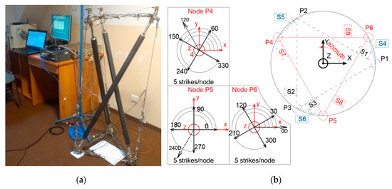 The vibration measurement: (a) the standpoint with accelerometers in the top; (b) notation and directions of the strikes applied to upper nodes.
