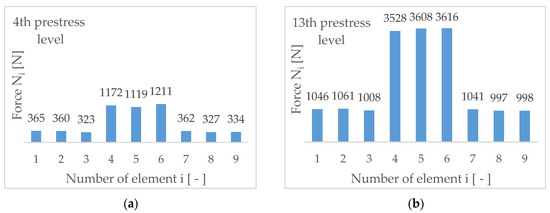 A distribution of the member forces between elements of the same type, i.e., the lower horizontal cables (1–3), the upper horizontal cables (7–9) and the cross-cables (4–6) for exemplary 4th and 13th prestress levels are presented in Figure 4 and correspond with numeration in Table 1. The forces are closely related with each other among each of the three groups during the prestressing process. The theoretical distribution of the member forces seems to be preserved with typical experimental fluctuations connected with crafting and measuring accuracy of the physical model.